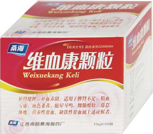 主治疾?。壕氲◇w瘦 耳嗚 精血虧虛 面色萎黃 缺鐵性貧血 營養(yǎng)性貧血 脾腎不足 眩暈; 腰膝酸軟維血康顆粒為棕色的顆粒;氣香,味甜、微酸。補(bǔ)腎健脾,補(bǔ)血養(yǎng)陰。適用于脾腎不足,精血虧虛,面色萎黃,眩暈耳嗚,腰膝酸軟,倦怠體瘦,營養(yǎng)性貧血、缺鐵性貧血屬上述證候者。